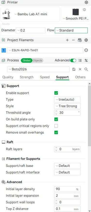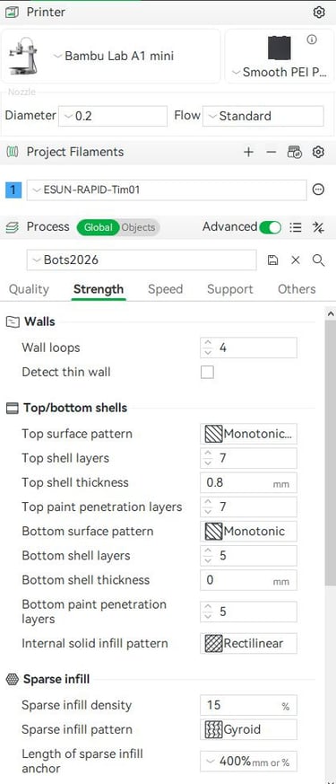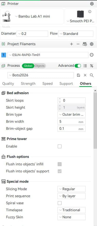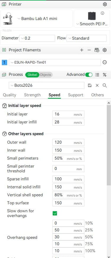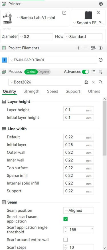 This is by no means a comprehensive 3D printing guide, but these are the settings I have had success with. I print my parts on a Bambu A1 mini with a smooth PEI plate and a 0.2 mm nozzle. I use eSUN PLA Basic in black.